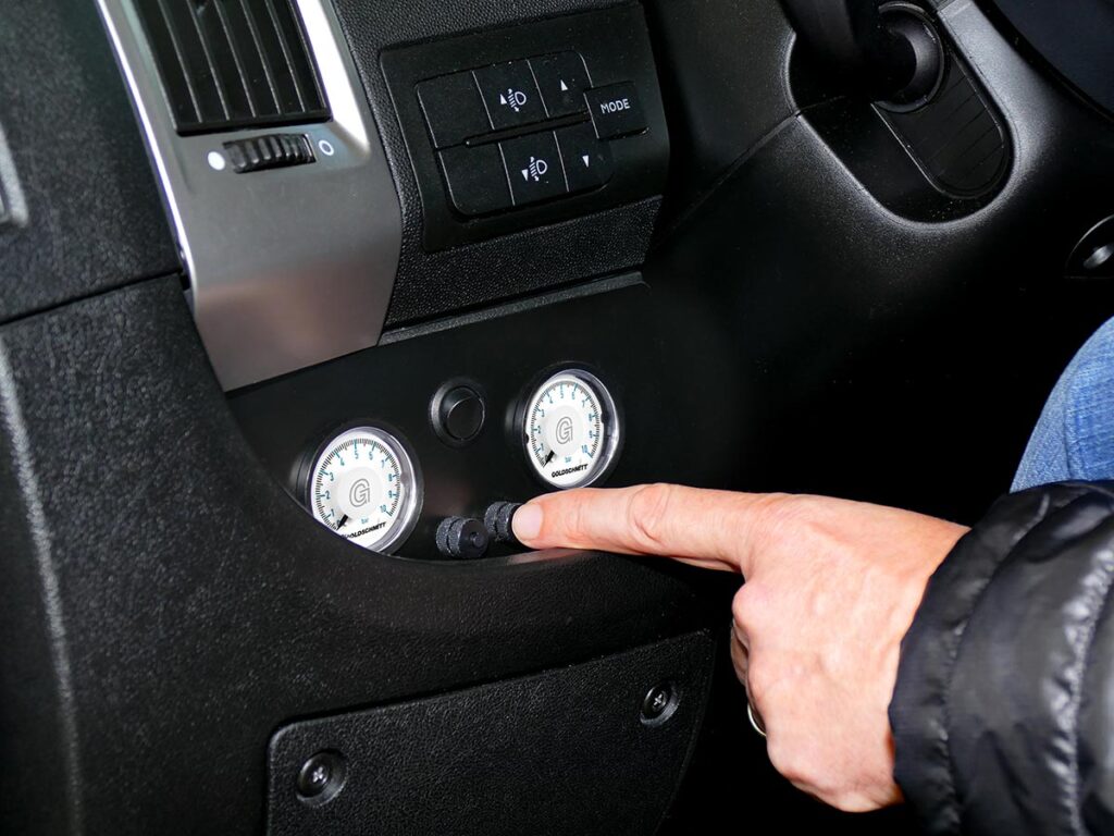Sowohl beim Smart- als auch beim Comfort-Paket haben Sie die Wahl zwischen manueller und automatischer Steuerung. Bei der manuellen Variante (Bild links) erfolgt die Bedienung händisch über ein serienmäßiges Manometer-Bedienteil. Per Knopfdruck lässt sich Luft in die Luftbälge einlassen und über zwei separate Ablassventile wieder ablassen, sodass sich die gewünschte Fahrzeughöhe individuell anpassen lässt. Die Überwachung des Luftdrucks erfolgt über zwei Manometer – jeweils eines pro Fahrzeugseite.