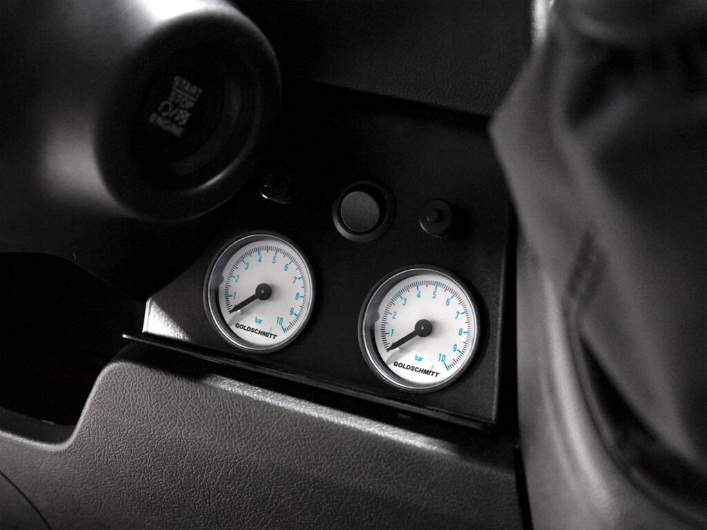 Neben der hochwertigen Hardware steht die Steuerung im Mittelpunkt unserer Zusatzluftfederungen. Die klassische Standardvariante verfügt über ein Fahrerhausbedienteil mit Manometern, Schalter zum Befüllen der Luftbälge und Ablassventilen für die linke und rechte Seite (Bild links). Damit sich das System harmonisch ins Fahrzeuginterieur einfügt, bieten wir für viele Modelle fahrzeugspezifische Cockpitblenden an. Alternativ stehen Universalbedienteile oder Ausführungen für ISO-genormte Radioschächte zur Verfügung. Die verbauten Druckluftmanometer sind optional mit Beleuchtung und Niederdruckwarnung erhältlich und bei manchen Anlagen bereits serienmäßig integriert.