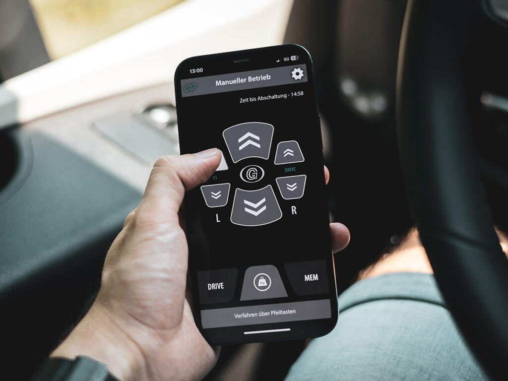 Wer höchsten Komfort und maximale Präzision wünscht, entscheidet sich für unsere RHC®-Steuerung: Präzise Niveausensoren erfassen kontinuierlich die Fahrzeughöhe, während die Software den Druck in den Luftbälgen automatisch anpasst – für stets optimales Niveau, auch bei wechselnder Beladung. Manuelle Eingriffe bleiben über das kompakte Bedienteil (Bild Mitte) jederzeit möglich. Mit nur drei Tasten lässt sich das gewünschte Fahrniveau automatisch herstellen oder das Fahrzeug manuell anheben und absenken. Zusätzliche Funktionen bietet die kostenlose Smartphone-App für iOS und Android (Bild rechts) – etwa die getrennte Regelung des linken und rechten Luftbalgs, dem Abrufen einer Wunschposition, die Einsicht von Live-Daten und Ereignisspeicher sowie eine optionale Wiegefunktion, die die Hinterachslast ermittelt und direkt auf dem Display anzeigt. Die Wiegefunktion ist nur bei Fahrzeugen mit ausreichendem Federweg verfügbar und muss einmalig durch eine Fachwerkstatt installiert und kalibriert werden. Die RHC®-Steuerung ist bereits für viele Fahrzeugmodelle erhältlich und lässt sich auch bei zahlreichen Standardsystemen der Marke Goldschmitt nachrüsten.