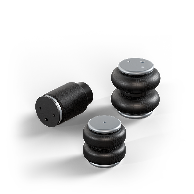 Die Federelemente einer Zusatzluftfederung können je nach Fahrzeugmodell in Dimension und Bauart variieren. Häufig kommen robuste Doppelfaltenbälge zum Einsatz, die entweder direkt auf die serienmäßige Blattfederung aufgesetzt oder daneben montiert werden und so die werkseitige Federung zuverlässig unterstützen. Die Vielfalt an Luftbälgen gewährleistet, dass jede Luftfederung optimal auf das Fahrzeug und seine Einsatzbedingungen abgestimmt werden kann.
