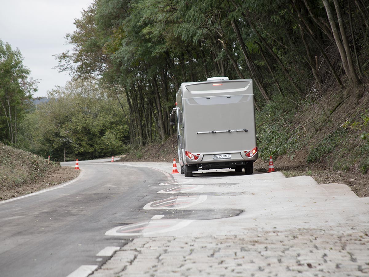 Obwohl es uns die moderne Technik heutzutage ermöglicht, Bauteile per Computersimulation auf eventuelle Schwachstellen zu untersuchen, werden alle Feder- und Fahrwerkskomponenten der Marke Goldschmitt im wahrsten Wortsinn auf Biegen und Brechen getestet. Auf unserer hauseigenen Erprobungsstrecke am Standort Höpfingen verlangen raue Pflastersteine, Sinuswellen, waschbrettförmige Abschnitte und große Schlaglöcher den Fahrzeugen alles ab. Unter diesen extremen Bedingungen können die Belastungen eines ganzen Fahrzeuglebens simuliert und hochwertige Fahrwerkstechnik auf Festigkeit und Stabilität geprüft werden. Zwei Wendeschleifen, jeweils am Anfang und am Ende der Schlechtwegstrecke, können ebenfalls ins Testprogramm mit eingebunden werden. Sie dienen zur Erprobung der Wankneigung von Reisemobilen, Transportern und Nutzfahrzeugen. All diese Maßnahmen dienen dazu, den hohen Qualitätsstandard unserer Produkte zu sichern und stetig weiterzuentwickeln. Damit garantieren wir Ihnen beste Qualität und innovative Entwicklungen – eben „Fahrwerkstechnik vom Feinsten“.